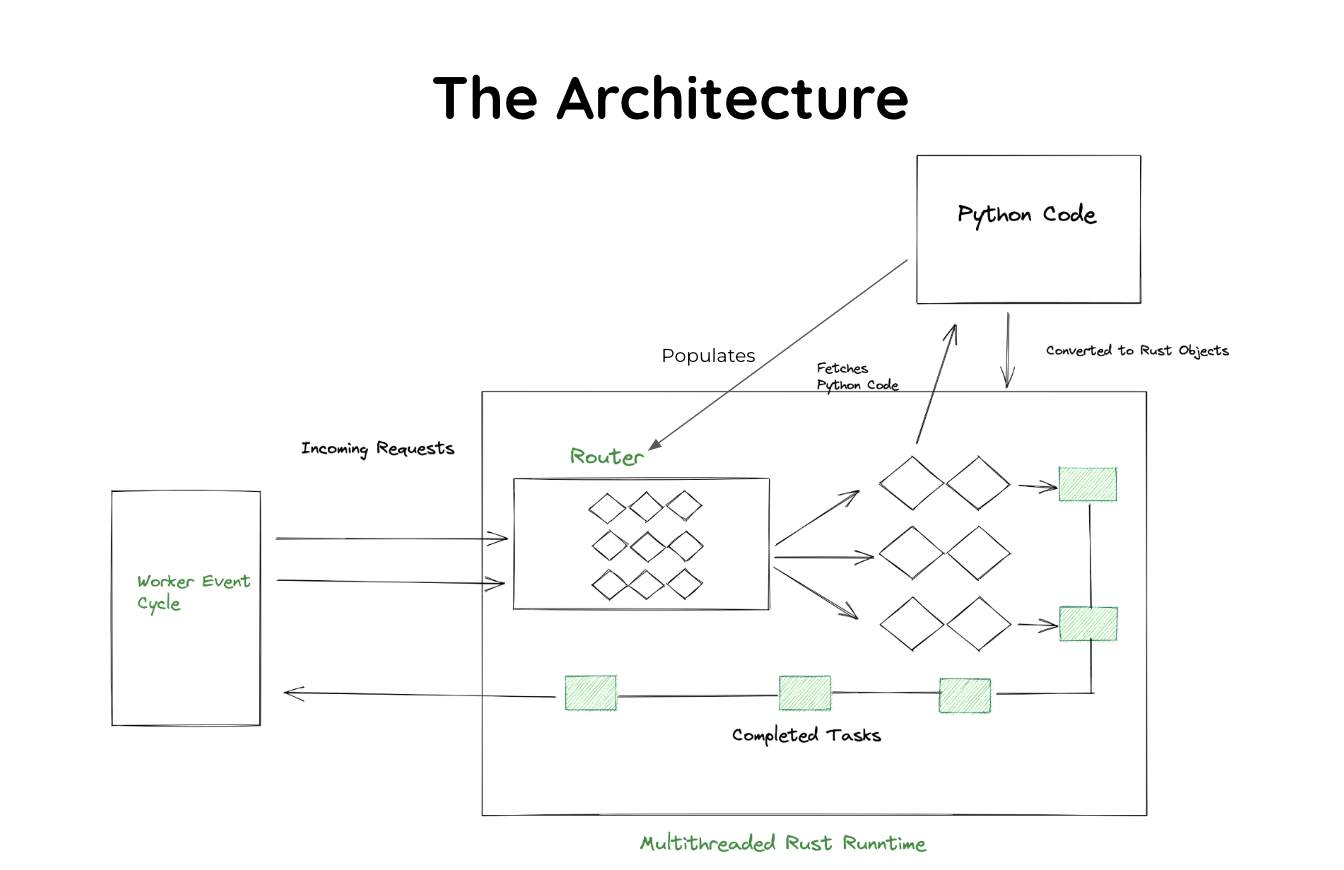 When the server is initiated with the python3 app.py command, Python code is dynamically transformed into Rust objects. Subsequently, the router gets populated. The architecture allows incoming requests to be matched against this router, and relevant Rust objects are queued for execution in the thread pool based on their types.